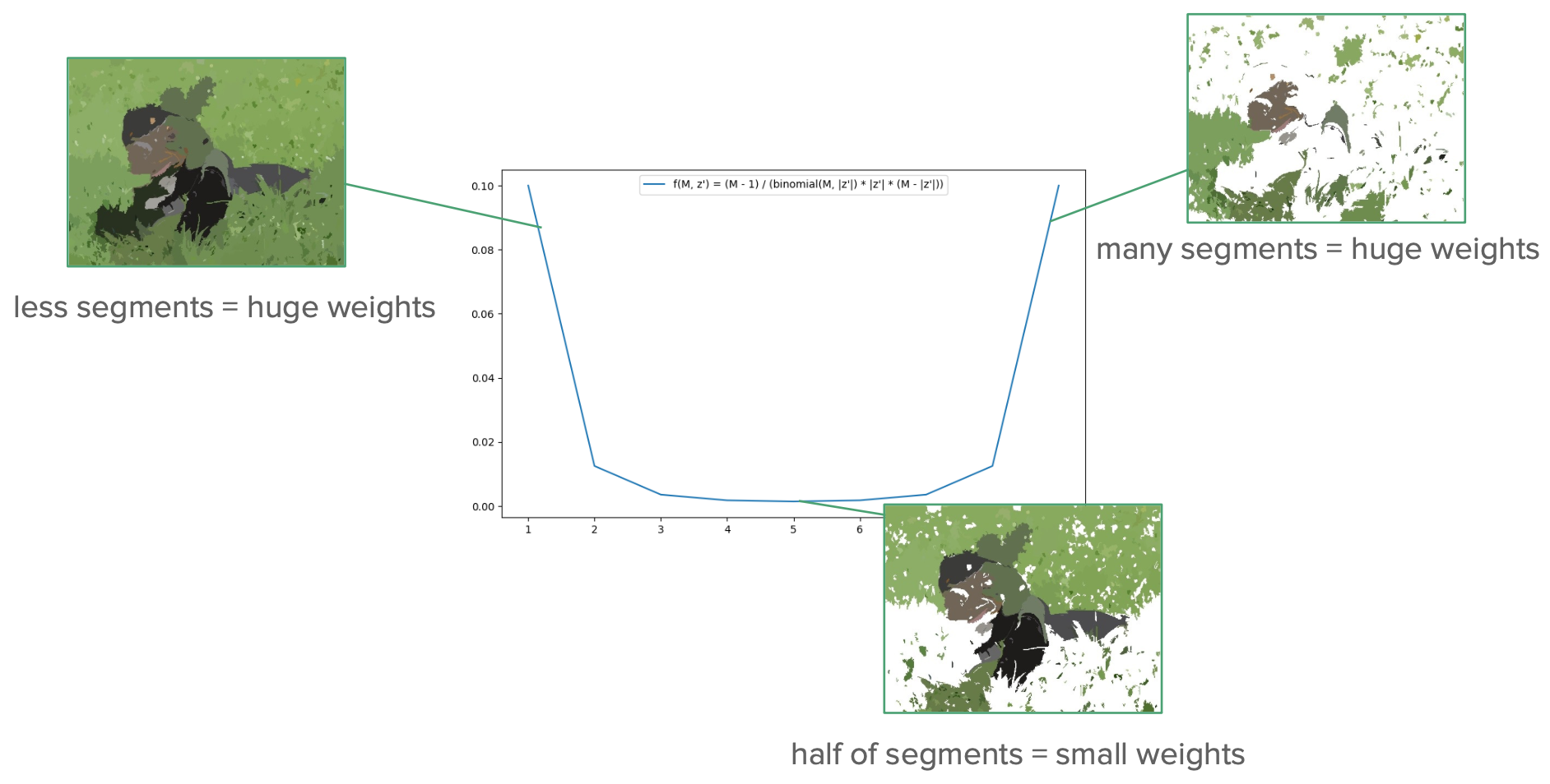 Disturbed images in which very many or very few segments are masked in or out are given high weights, while images in which approximately half of the samples are masked in and out are given a weight close to zero. This way images, in which the influence of a single segment can be preciseley assessed, are higher weighted than those, for which this is not possible.